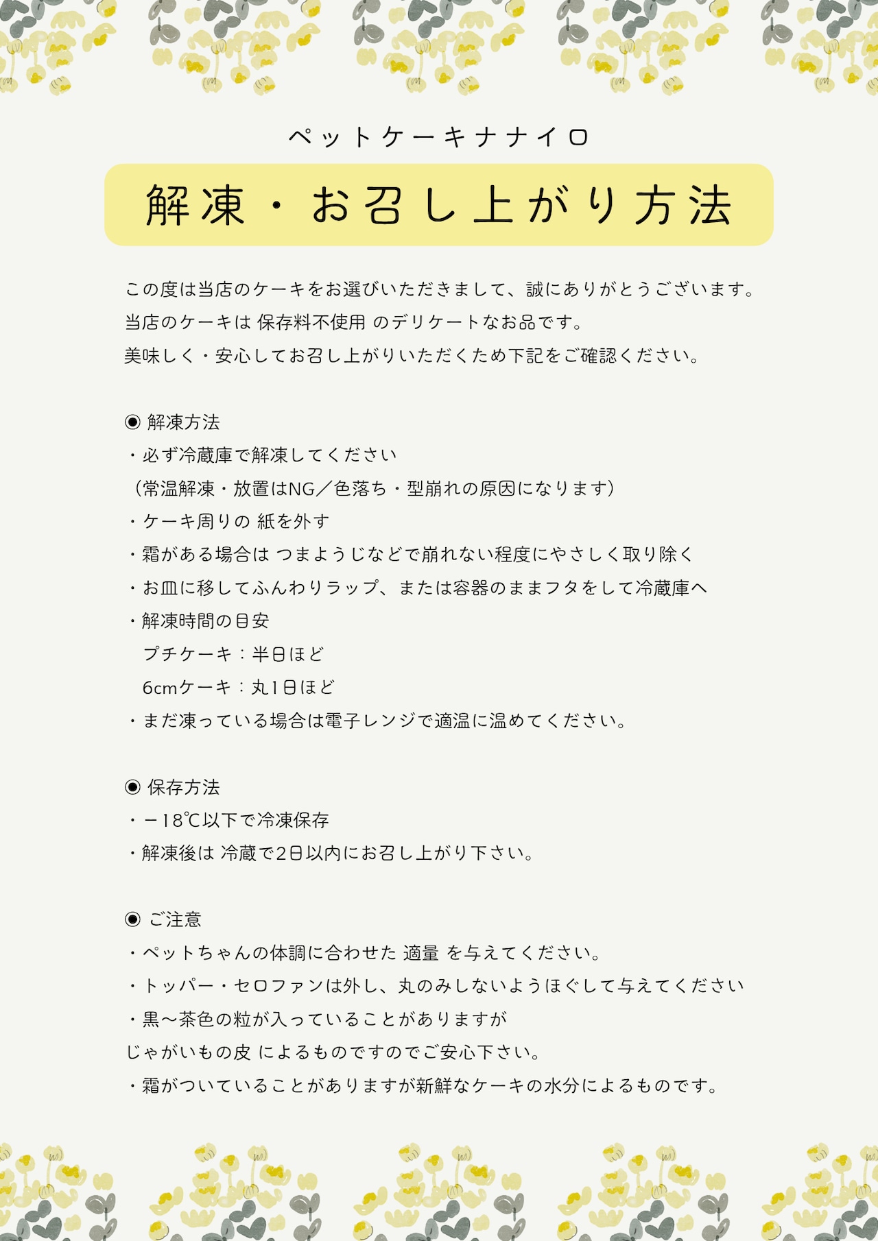 「解凍・お召し上がりに際してのご注意」同梱